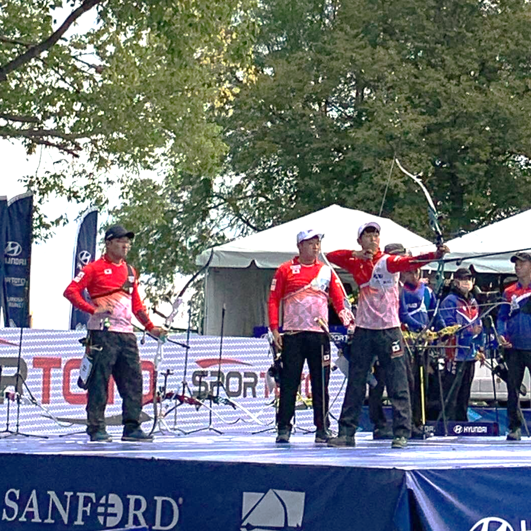 予選ラウンドでの同一チーム3名の合計点により、上位16チームが団体戦の決勝ラウンドに出場することができます。トーナメント方式で、1セット6射(チームの各選手が2射ずつ:60点満点)の4セット制によるマッチ戦が予選ラウンドと同様、距離70m、122cmの標的を使用して行われます。 セットの制限時間は2分。3名の選手が1人ずつ交代して6本を射ちます。時間内に6本の矢を射つためには、3名の選手の時間配分が重要となり、チームワークが勝利の鍵となります。セットポイントは、個人戦と同様、勝てば2ポイント、引分けは両者に1ポイント、負ければ0ポイント。先に5ポイント以上獲得したチームが勝者となります。 |